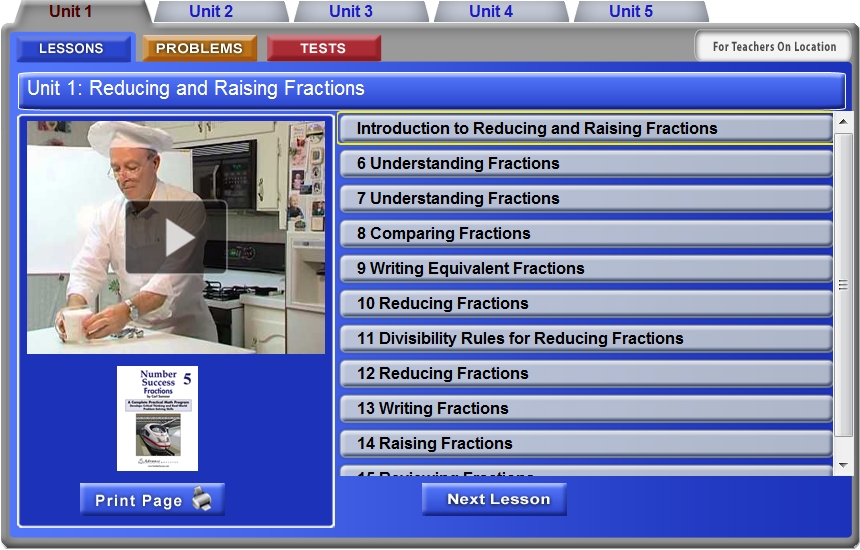 An added feature of Number Success is that teachers can directly go to on-location scenes. These on-location scenes usually come after a teacher has taught a related lesson. And now teachers can go directly to the real-life application. These many real-world examples from addition to trigonometry will be of great help in reinforcing the lessons teachers are helping their students to learn. |